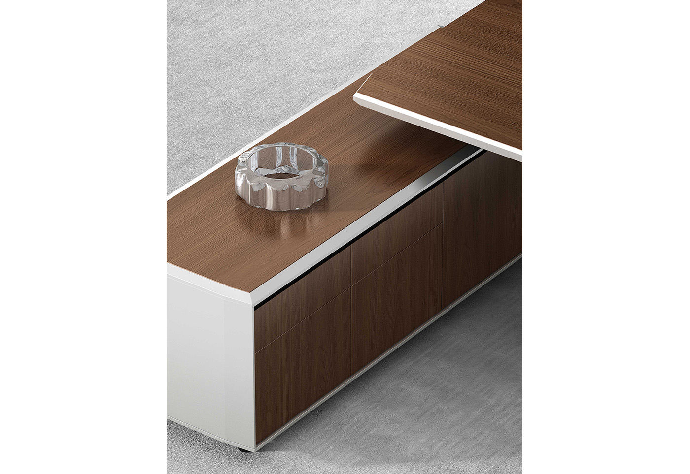 1.基材:采用威利邦進(jìn)口生產(chǎn)線E0級中密度纖維板; 2.油漆:臺灣大寶水性凈味漆; 3.五金:“FGV”牌緩沖導(dǎo)軌+“FGV”牌阻尼門鉸+鍍珍珠鉻色鉛筆拉手; 4.配件:打砂氧化銀色鋁合金型材包邊、鋁合金臺面分隔裝飾條; 5.皮革:灰色皮紋; 6.走線:副柜內(nèi)部走線,內(nèi)配?80圓形過線盒+86線盒孔;