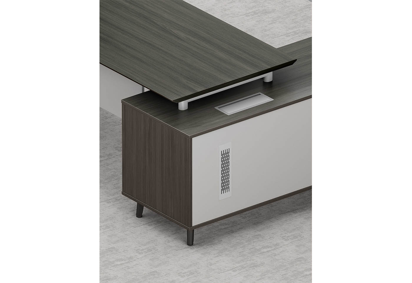1.工藝:采用E0級刨花板貼三聚氰胺飾面 2.封邊:采用優質PVC封邊 4.五金:鋼制支撐架(2.0mm壁厚); 5.配件:鋁框桌屏散熱蓋+“BMB”牌緩沖導軌+“BMB”牌阻尼門鉸+優質鋁框桌屏翻蓋線盒+機械密碼鎖; 6.班臺分左右;