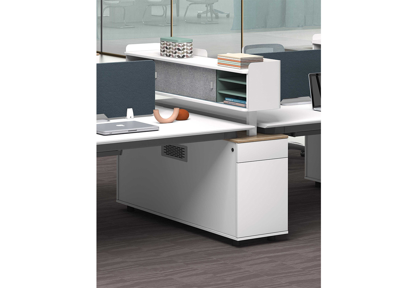 1.工藝:采用E0級刨花板貼三聚氰胺飾面 2.封邊:采用優質PVC封邊 3.屏風:ML403藍色皮紋無框桌屏; 4.五金:鋼制文件架擋板(壁厚1.5mm)+1.5mm壁厚鋼腳+1.6mm壁厚鋼制橫梁; 5.配件:優質鋁合金散熱蓋+優質鋁合金趟門配件+鋁合金拉手+優質ABS圓柱形調節腳; 6.走線:臺面配OP線蓋; 7.選配:可選配多款線槽;