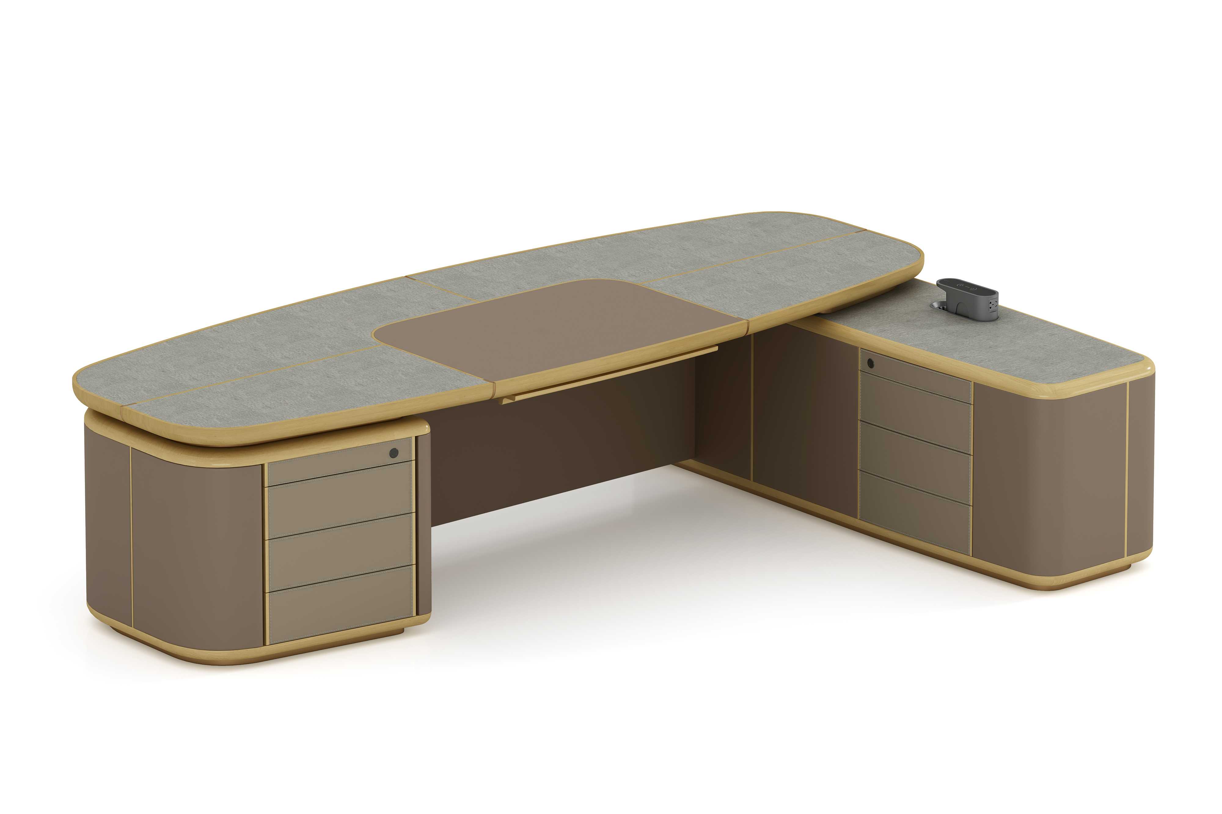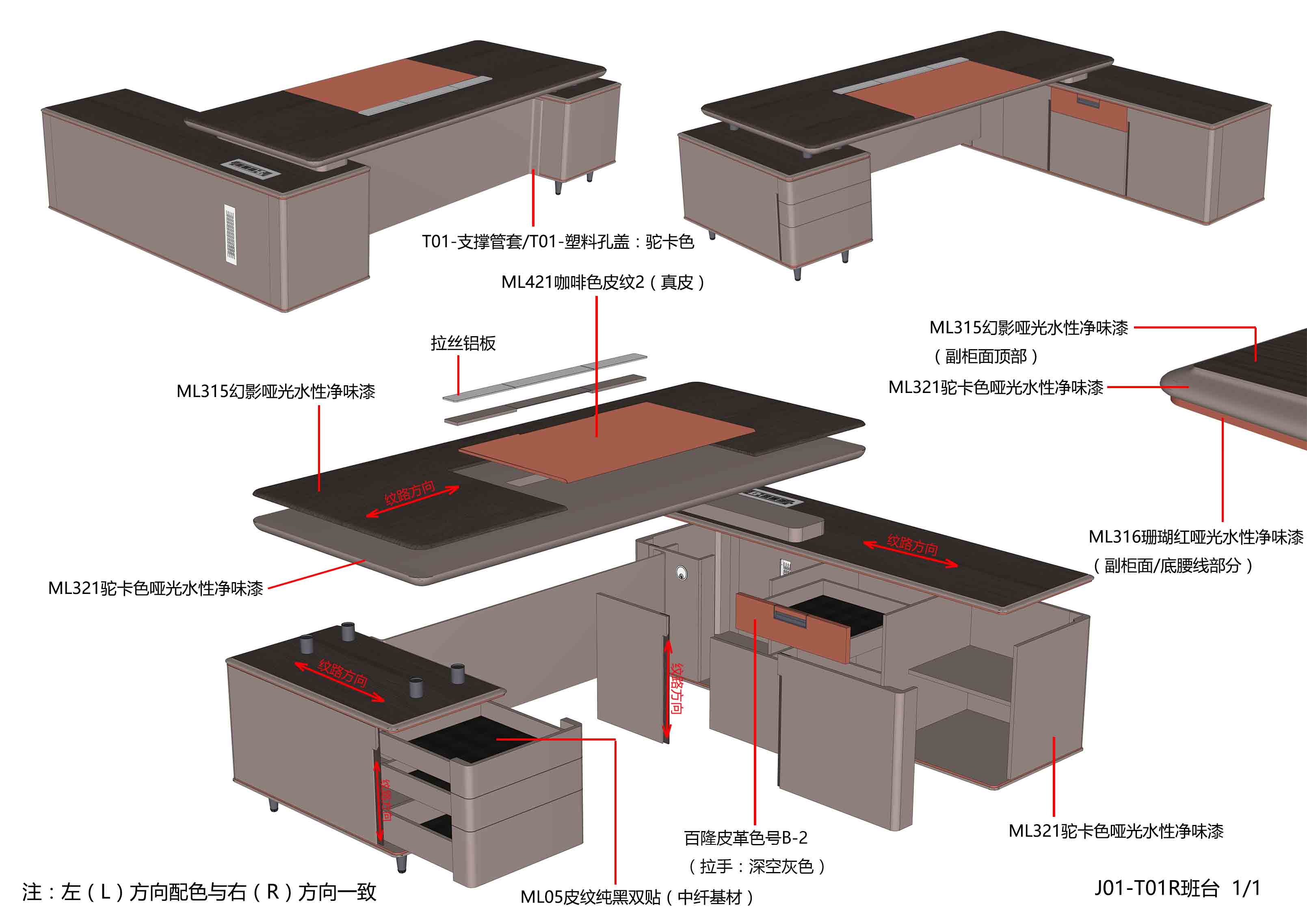 1.工藝:見光面采用E0級中密度纖維板+0.6mm染色木皮做水性漆/實色水性漆 2.封邊:見光面天然木皮封邊/實色水性漆+楓木實木封邊 3.細節:臺面帶固定皮墊,抽面捫皮; 4.配件:“BMB”緩沖門鉸+隱藏式按彈導軌+指紋三聯鎖+明裝式反彈器+吊文具抽; 5.五金:底座\支撐采用玫瑰金不銹鋼框,臺面配玫瑰金不銹鋼裝飾件; 6.走線:臺面配按彈過線電源,副柜內部走線,內配?80圓形過線盒,配超級電源; 7.班臺分左右;