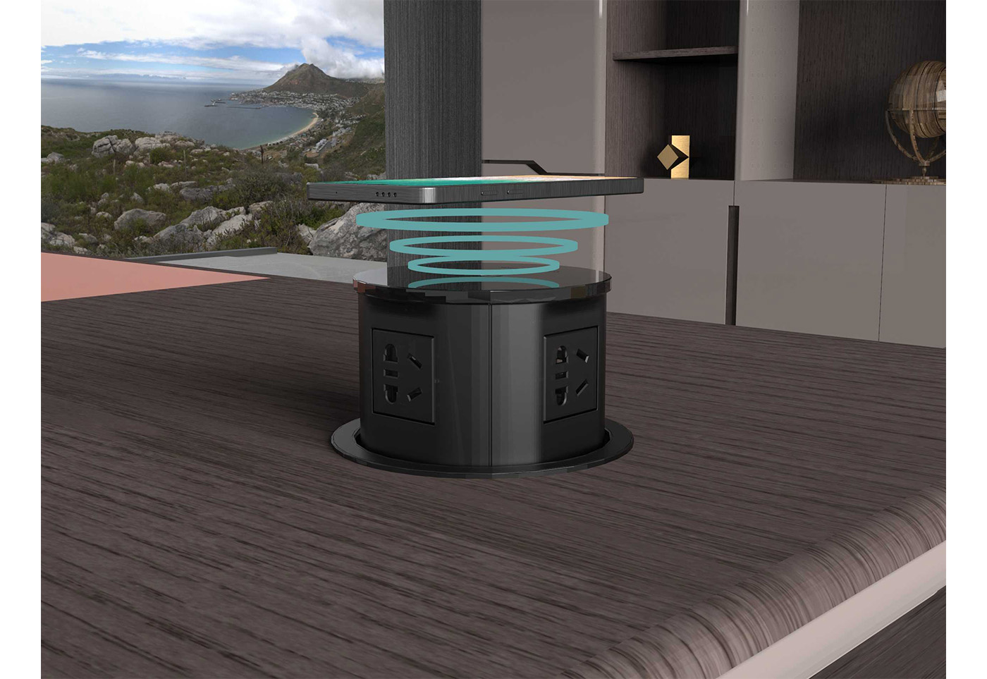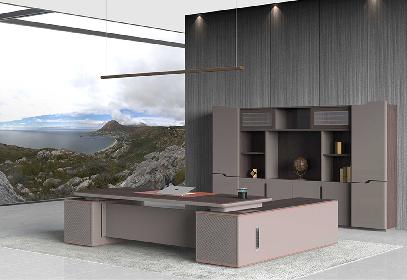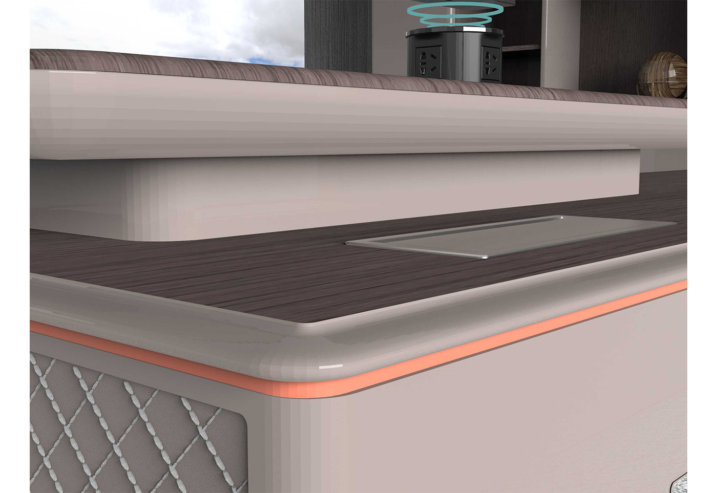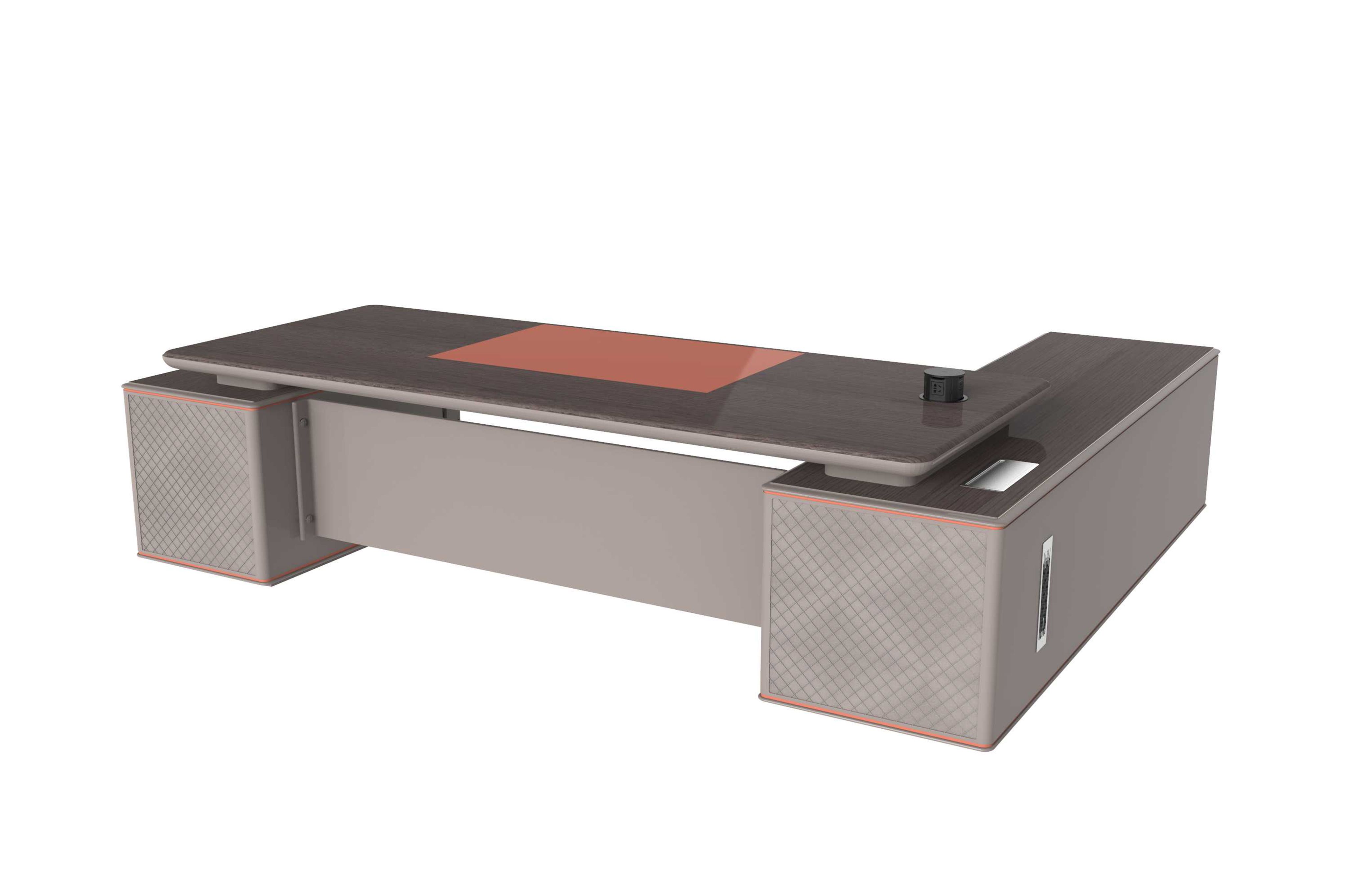 1.工藝:見光面采用E0級中密度纖維板+0.6mm染色木皮做水性漆/實色水性漆 2.封邊:見光面天然木皮封邊/實色水性漆 3.細節:臺面帶固定皮墊,抽面捫皮,副柜帶捫皮裝飾板; 4.配件:“BMB”牌緩沖導軌+“BMB”阻尼門鉸+鋁合金金屬散熱蓋+金屬支撐腳+優質ABS底盒; 5.走線:副柜內部走線,內配?80圓形過線盒,副柜配高端電動翻轉電源; 6.班臺分左右; 7.桌面可選配無線暗彈電源