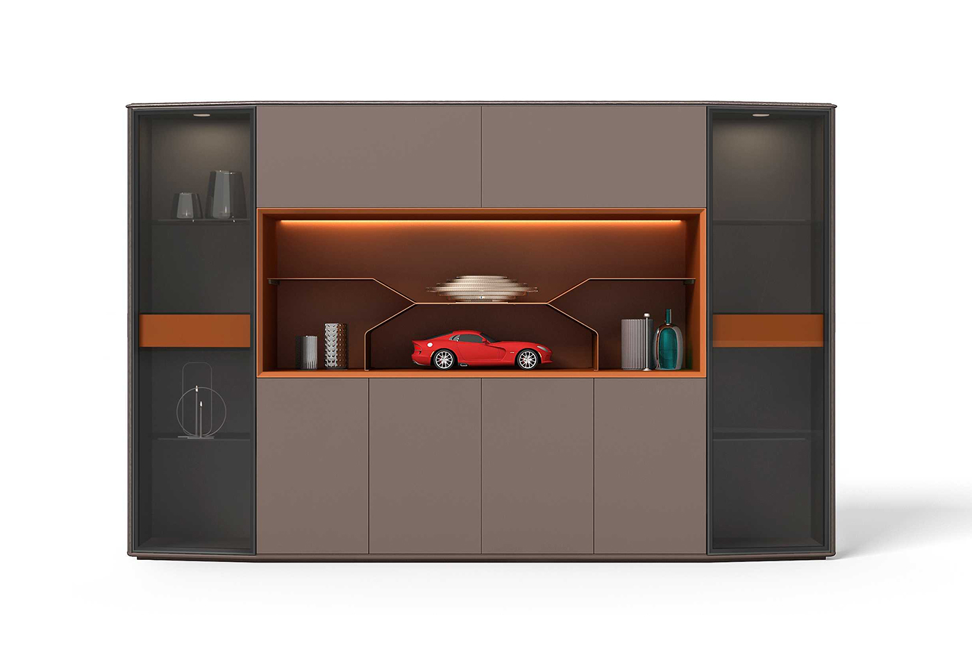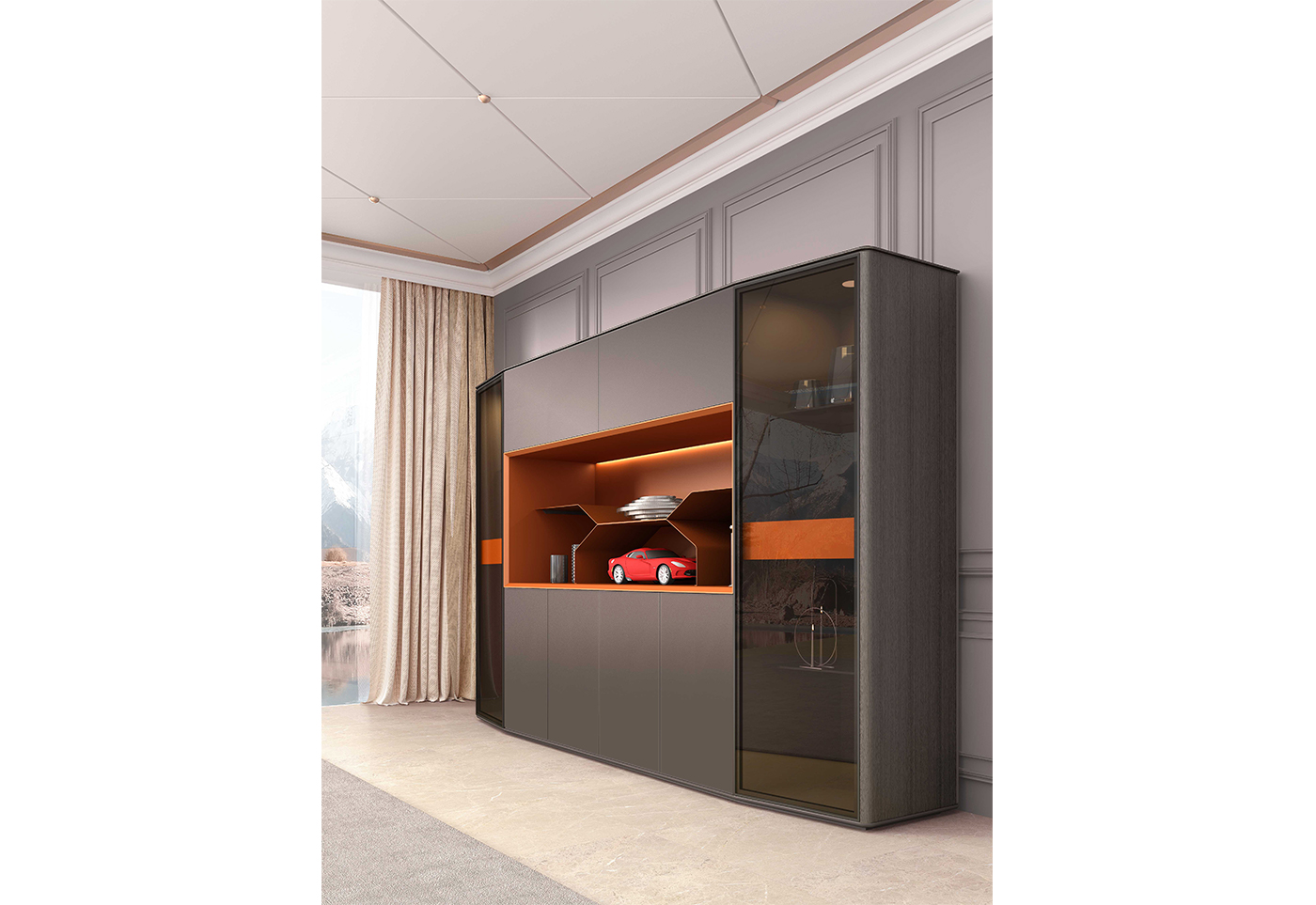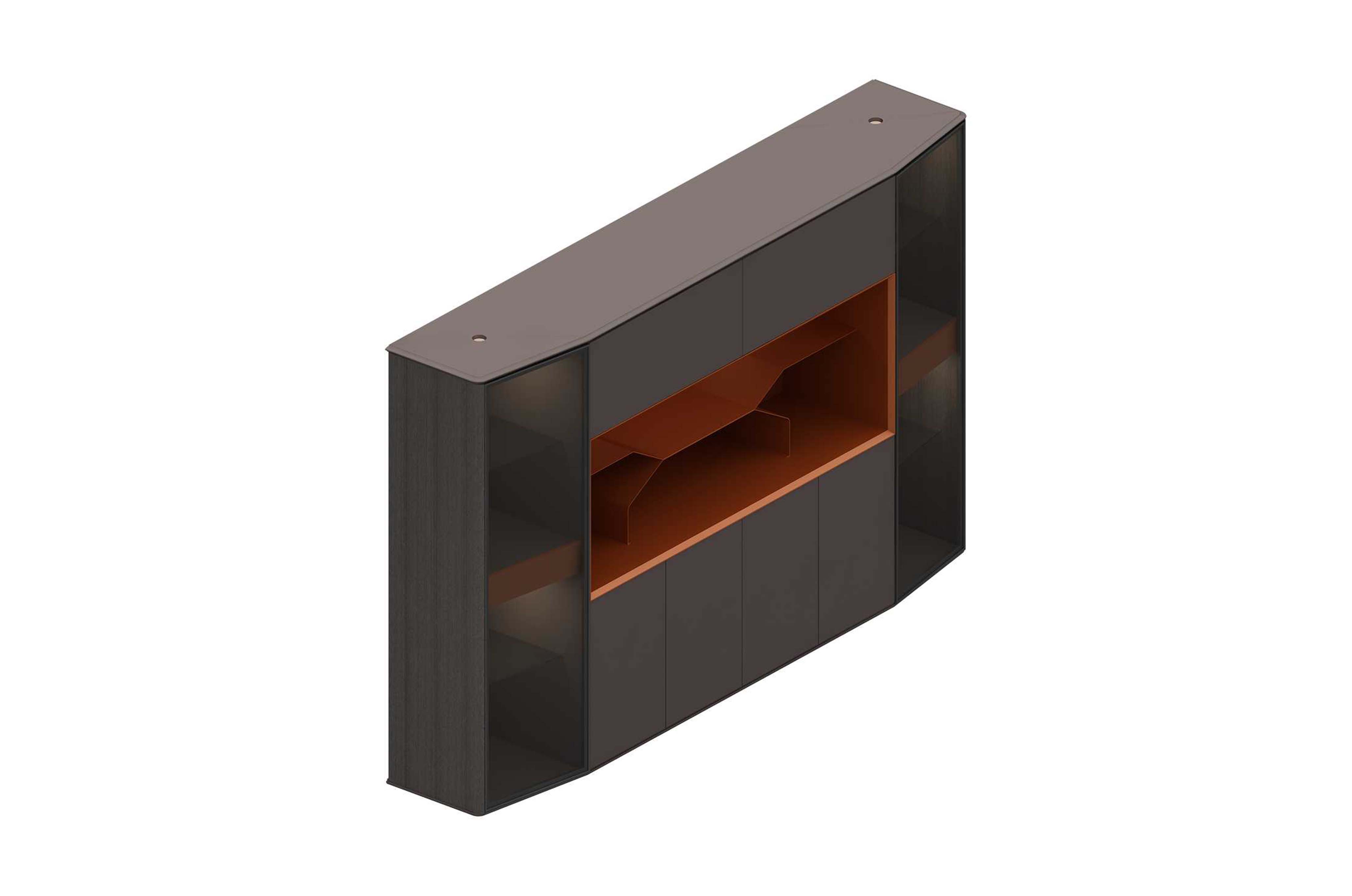 1.工藝:見光面采用E0級中密度纖維板+0.6mm天然木皮做水性漆/實色水性漆 2:配件:超窄邊框玻璃門(配進口電動開合天地鉸鏈)+柜內8mm鋼化玻璃層板+內配高端燈帶及射燈+進口自動上翻門系統+全鋼制金屬層板+“BMB”阻尼門鉸;