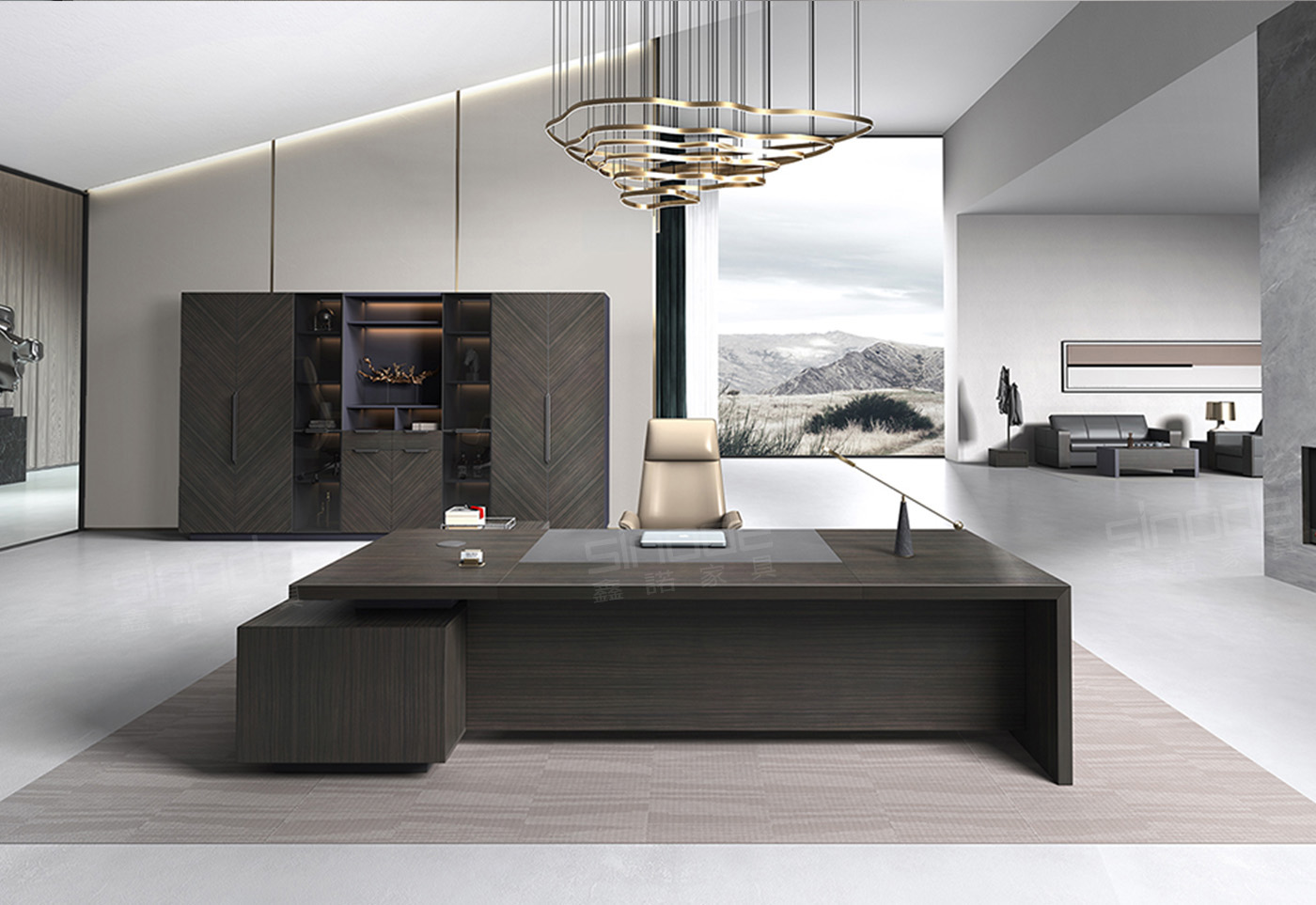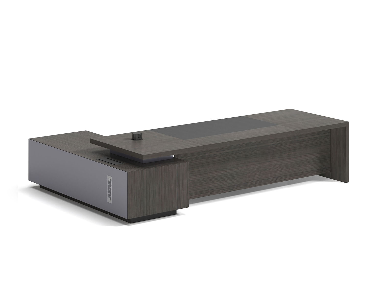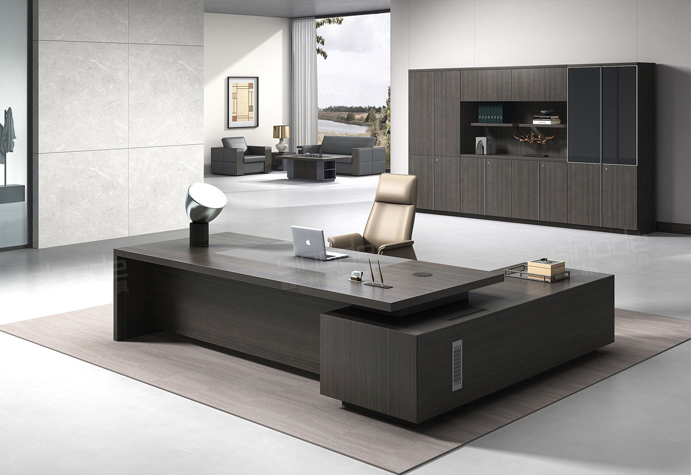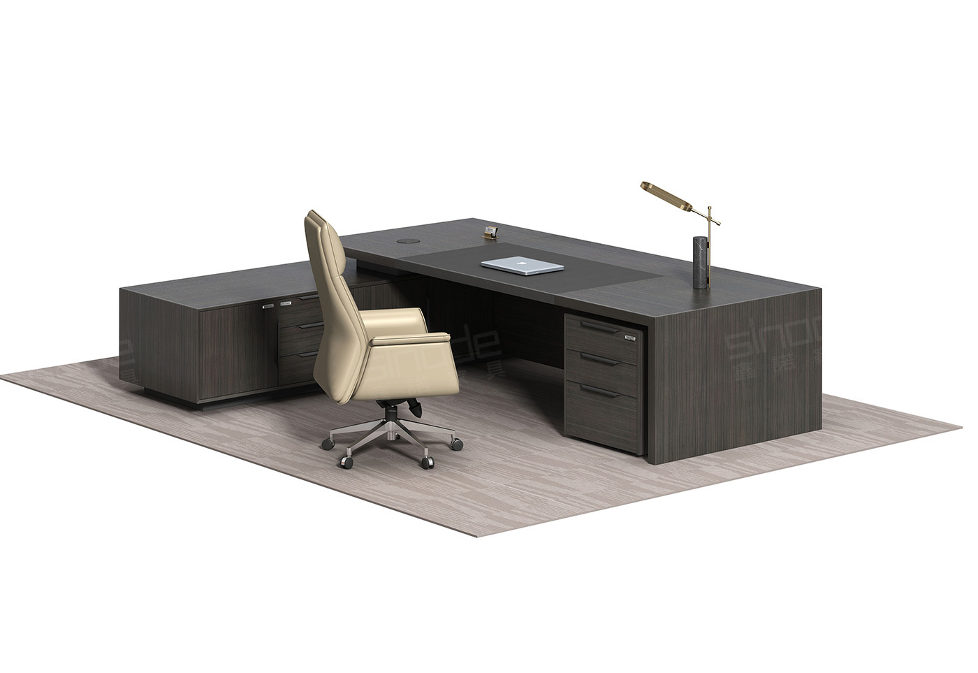 1.工藝:見光面采用E0級中密度纖維板+0.6mm天然木皮做水性漆,非見光面采用E0級刨花板貼三聚氰胺飾面; 2.封邊:見光面天然木皮封邊,非見光面采用優質PVC封邊; 3.細節:臺面、副柜做海棠角工藝,上下左右各留3MM工藝垂直倒角,臺面內嵌皮墊 4.配件:“BMB”緩沖門鉸+“BMB”緩沖三節導軌+機械密碼鎖+新款通體拉手+鋁合金散熱蓋; 6.走線:副柜內部走線,內配?80圓形過線盒,配OV鋁合金線盒; 7.班臺分左右; 8.選配:桌面可配無線充按彈電源,
