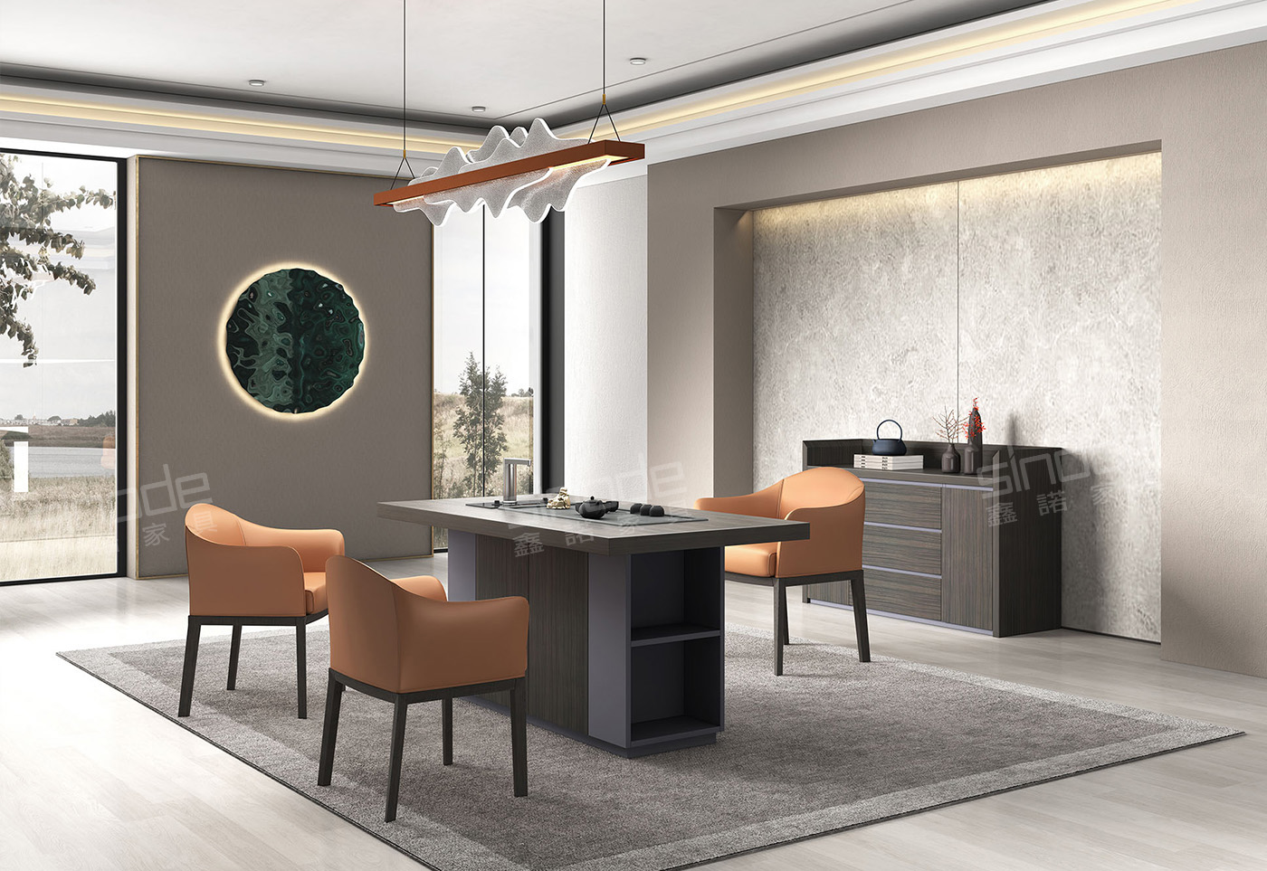 1.工藝:見光面采用E0級中密度纖維板+0.6mm天然木皮做水性漆,不見光面采用E0級刨花板貼三聚氰胺飾面; 2.封邊:見光面天然木皮封邊,非見光面采用優(yōu)質(zhì)PVC封邊; 3.配件:“BMB”緩沖門鉸+“BMB”緩沖三節(jié)導(dǎo)軌+內(nèi)嵌式高端烏金石茶臺+高端智能茶具(304#食用級不銹鋼);