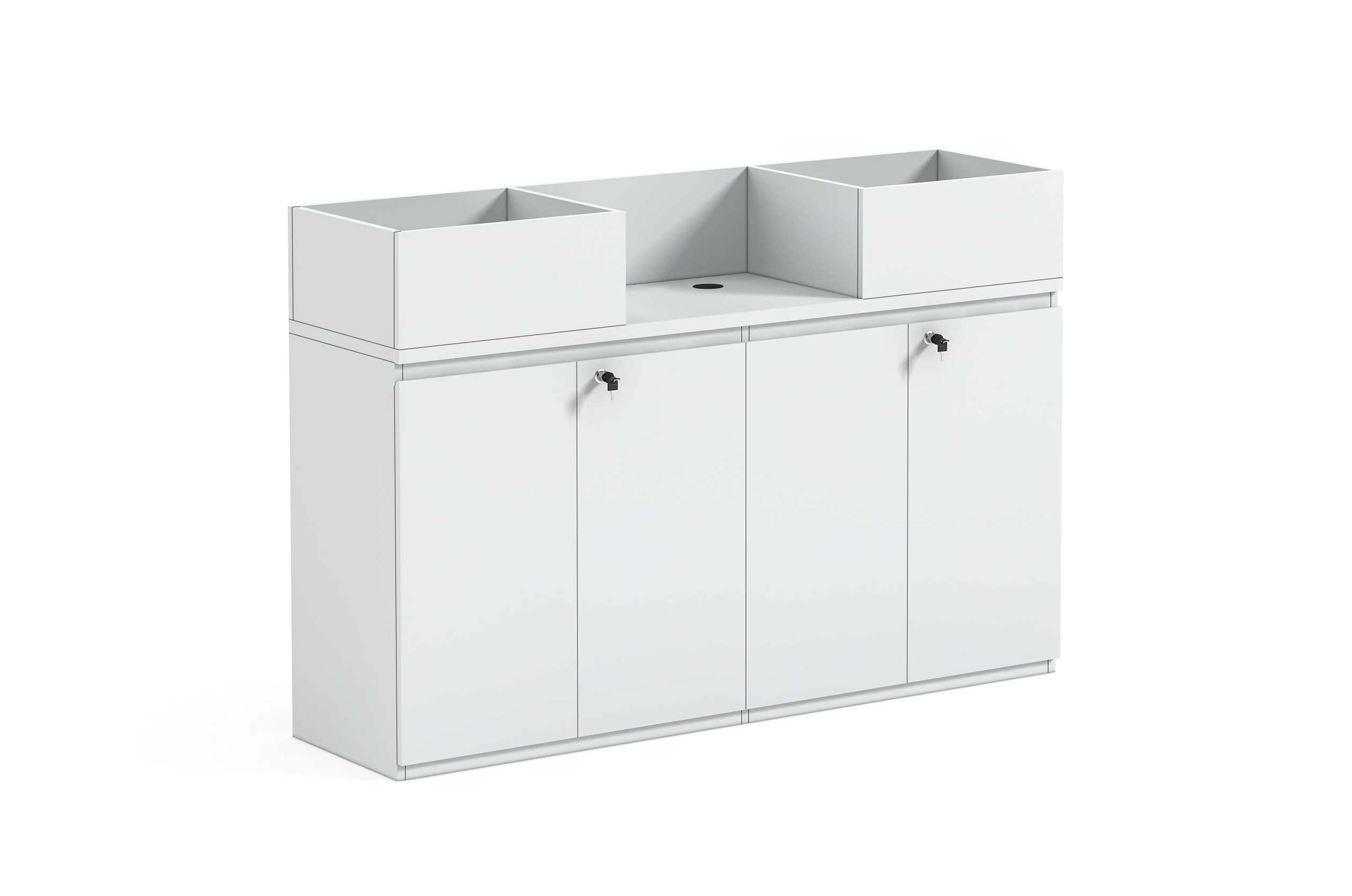 1.工藝:采用E0級刨花板貼三聚氰胺飾面 2.封邊:采用優質PVC封邊, 3.配件:優質阻尼門鉸+優質雙門鎖+?80圓形過線盒(可放置450mm以下長度打印機); 4.花槽須做好防水,避免澆水時外溢。